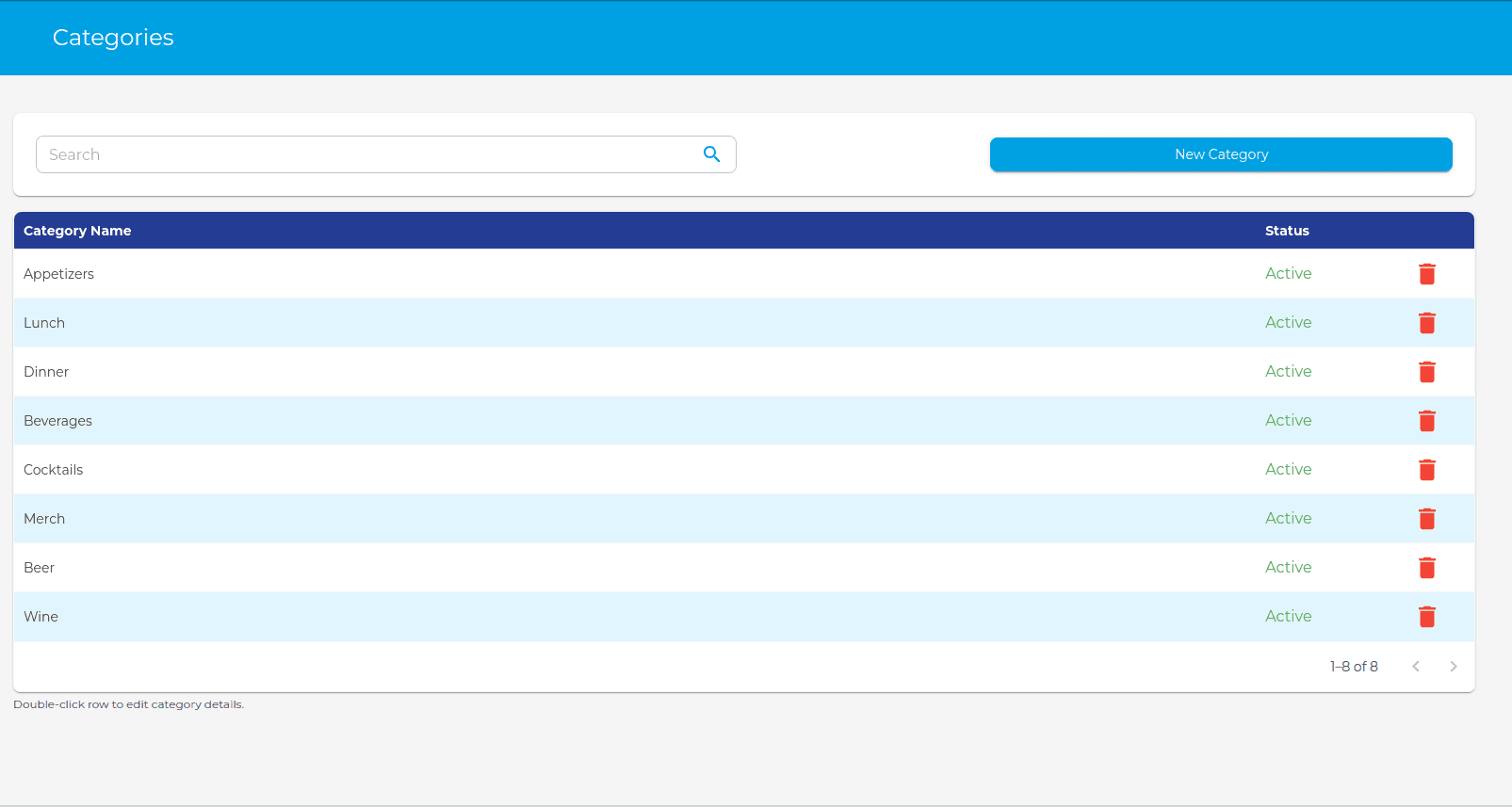 - To delete a category, click the red trash icon on the row of the category.