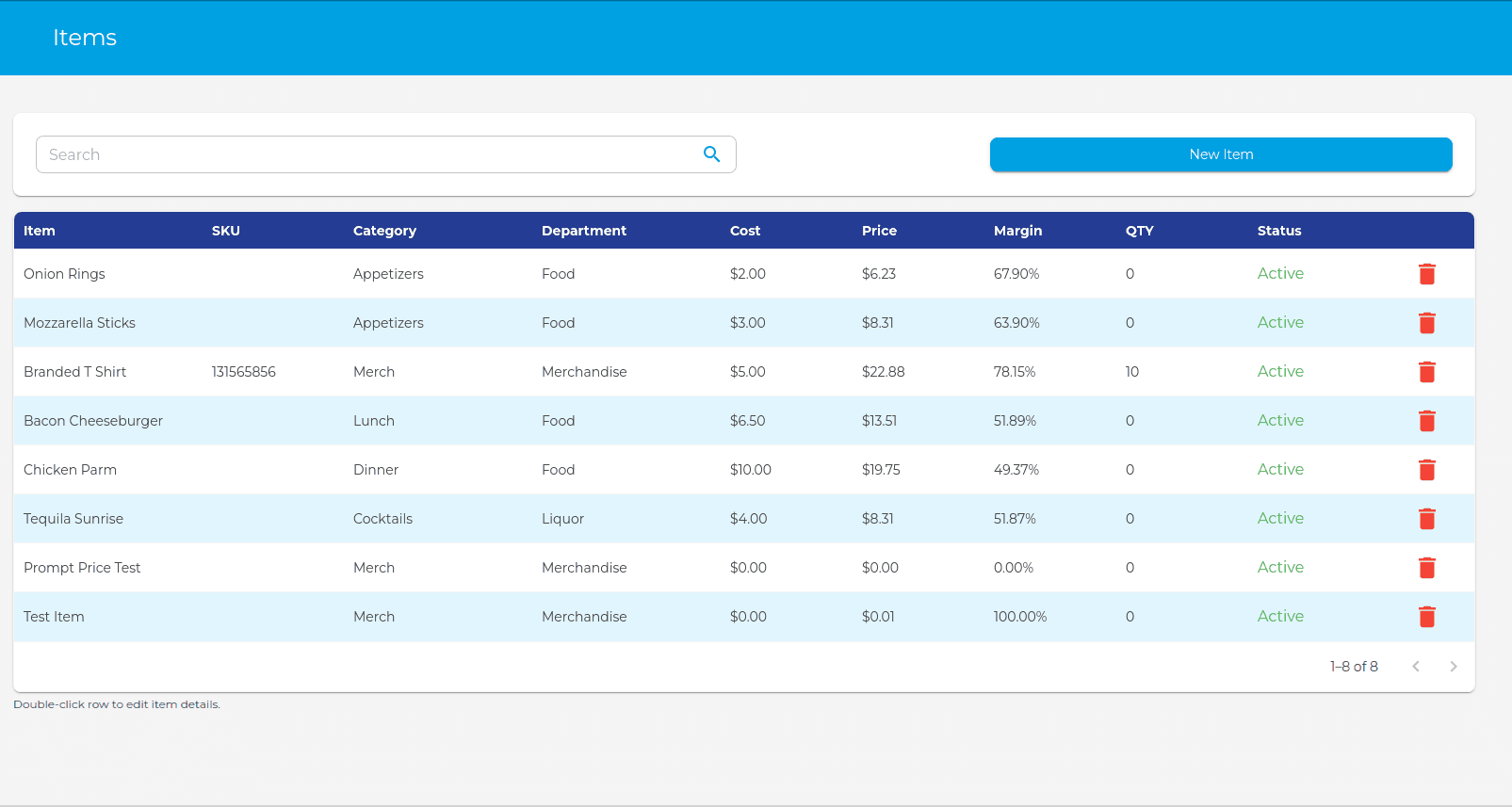 - To delete an item, click the red trash icon on the row of the item.