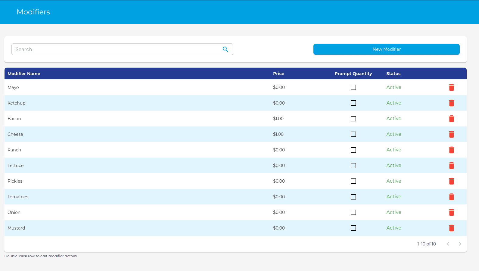 - To delete a modifier, click the red trash icon on the row of the modifier.