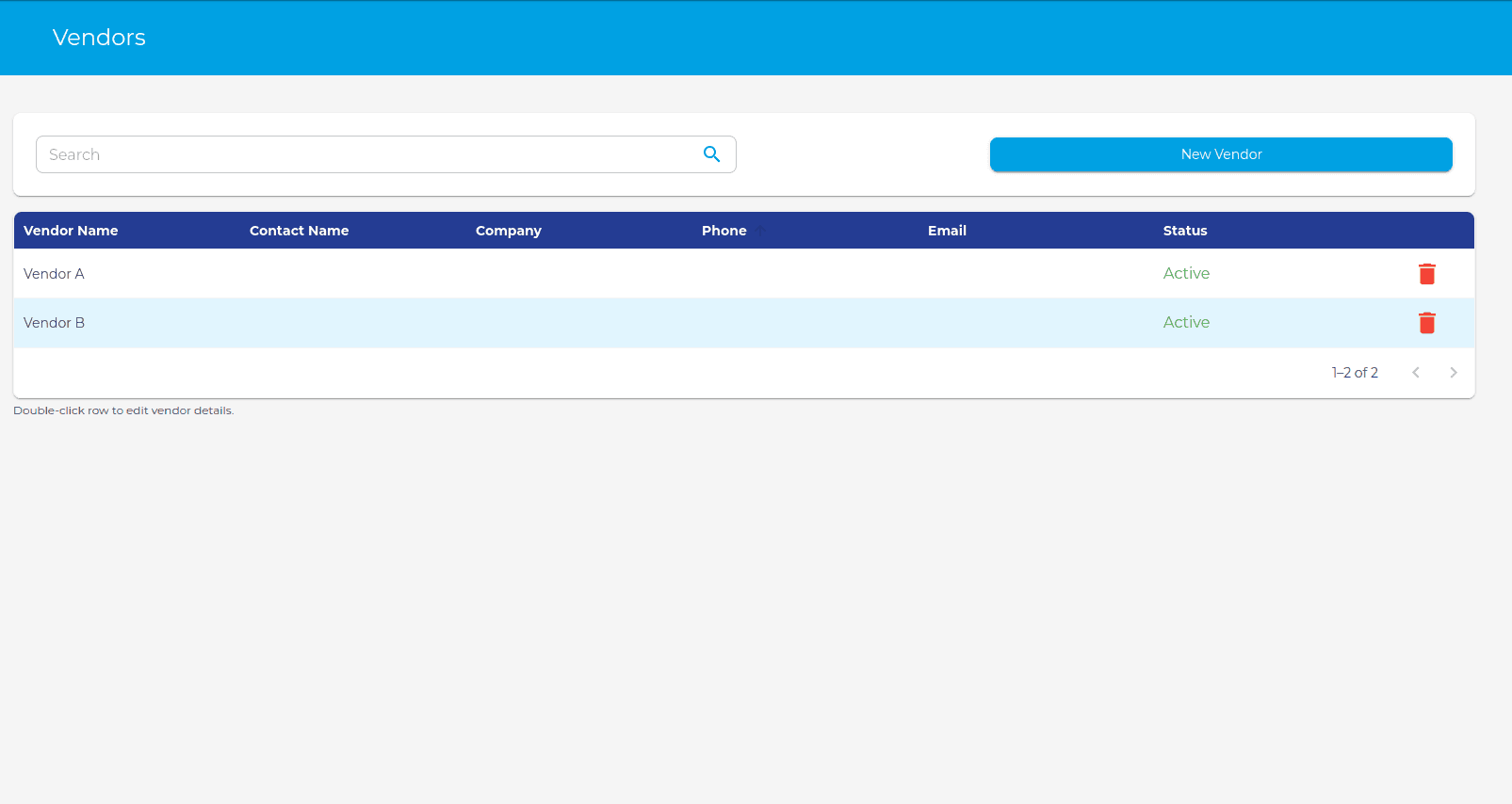 - To delete a vendor, click the red trash icon on the row of the vendor.